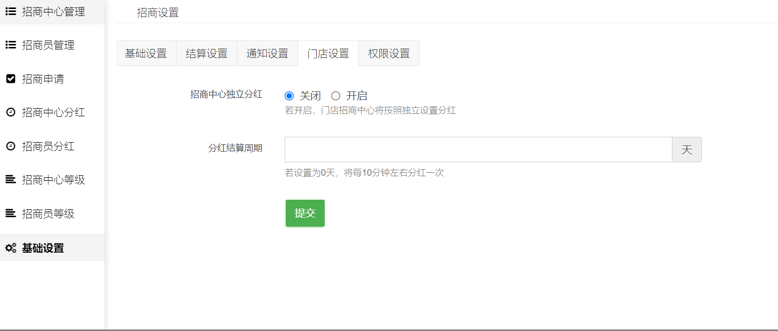 1.设置是否开启门店招商中心独立分红,若开启,门店招商中心将按照独立设置分红