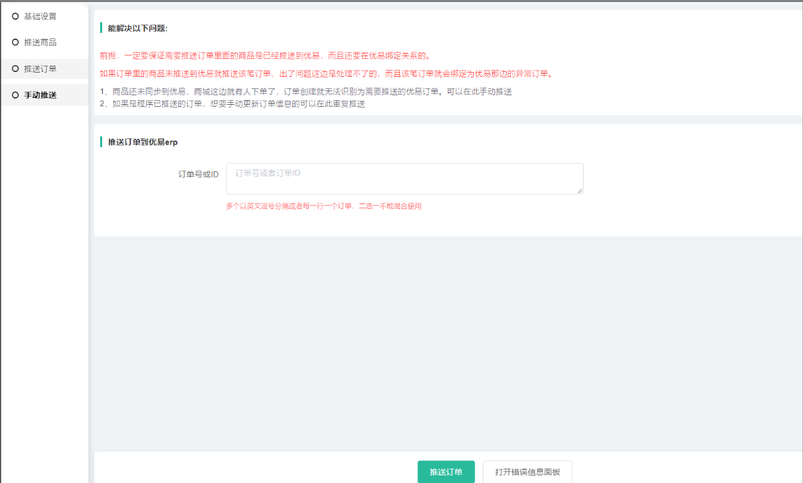 1)一定要保证需要推送订单里面的商品是已经推送到优易,而且还要在优易绑定关系的。
