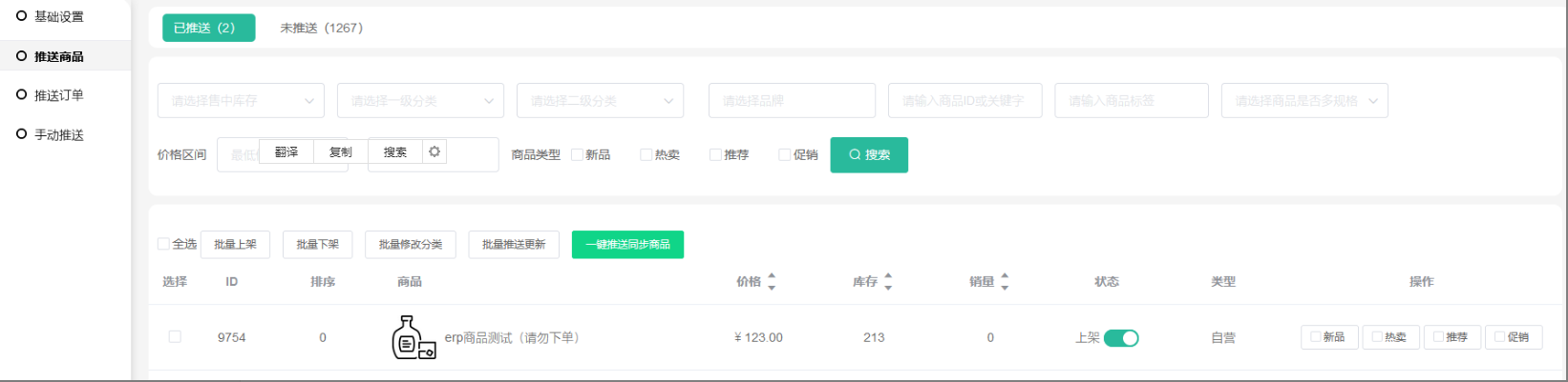 2、一键推送同步商品(把商城自营全部未推送的商品推送到第三方)