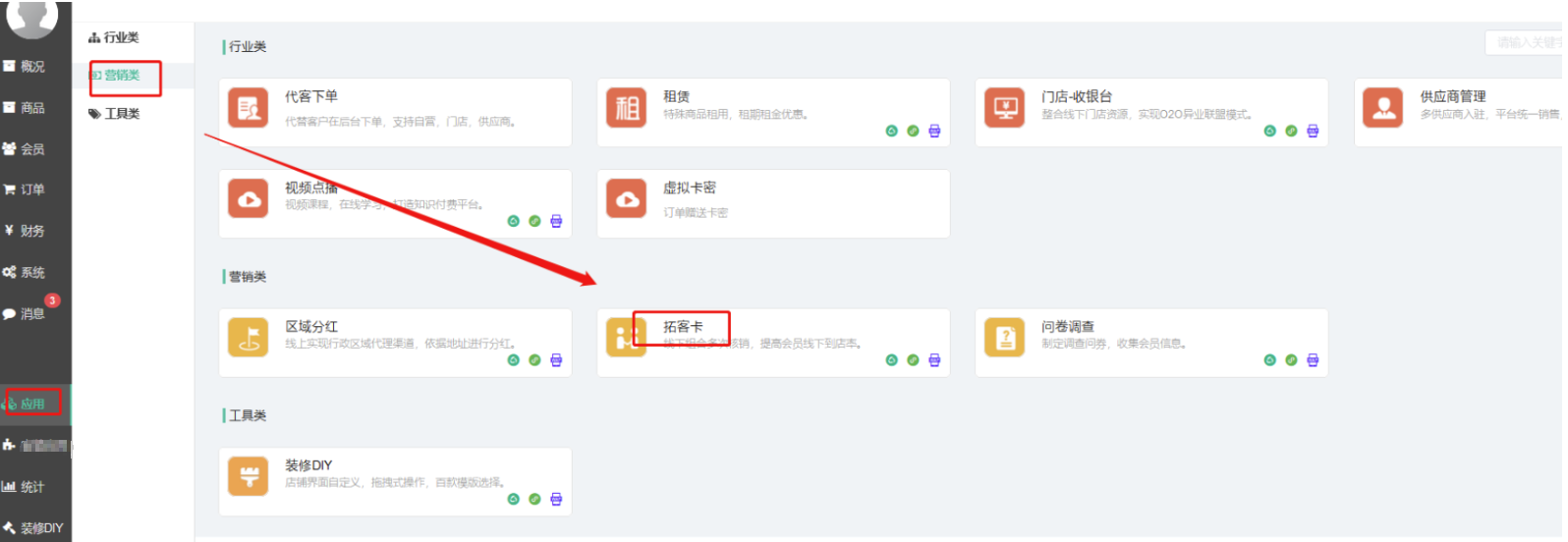 第五步:打开应用——营销类——拓客卡——拓客卡管理——添加拓客卡