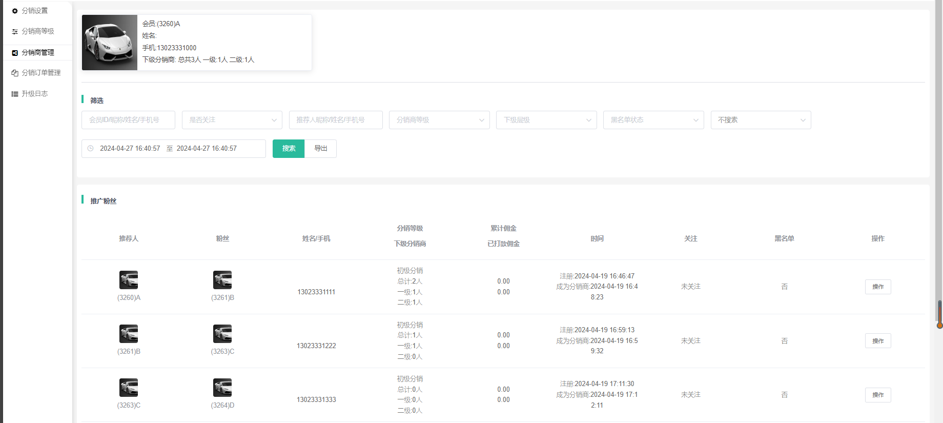 搜索可按照成为分销商时间/会员信息/是否关注/推荐人/分销商等级/状态,搜索导出列表记录信息