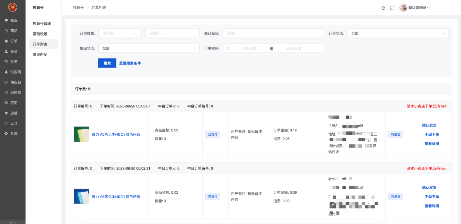 同步所有视频号小店的订单,默认订单同步后自动下单到小商店并同步到中台下单;也可以手动下单