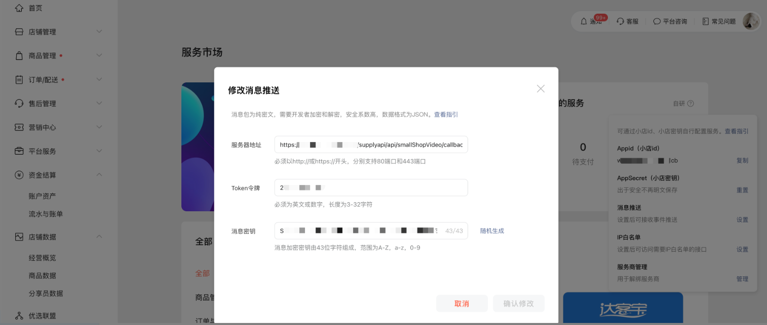 登录视频号小店官方后台,在服务市场--我的服务--自研中复制对应的参数。