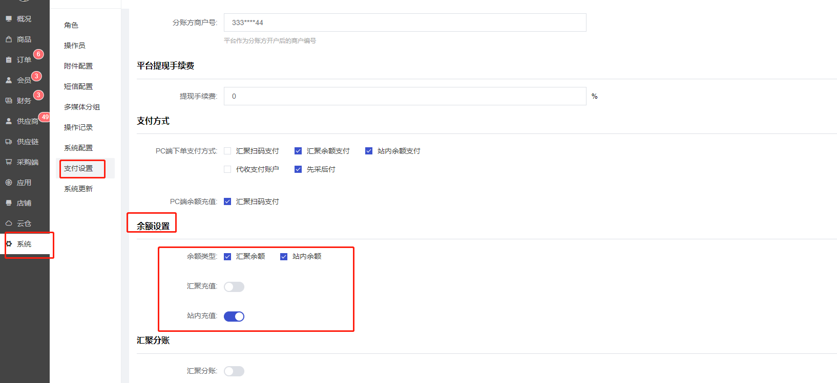 余额类型:汇聚余额、站内余额(勾选之后在前端显示)