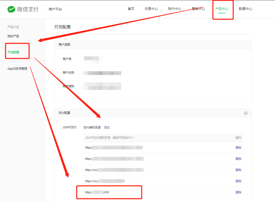 3、接着配置微信支付授权目录,路径:微信商户号后台pay.weixin.qq.com -- 产品中心 -- 开发配置 -- 添加JSAPI支付授权目录.