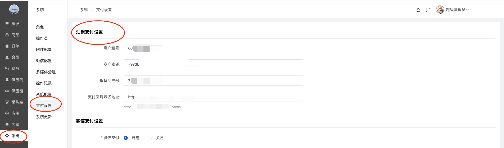 注:控制汇聚支付开关的前提是,汇聚支付的所有信息需要配置好,如果没配置 即使开关开了也不会显示。