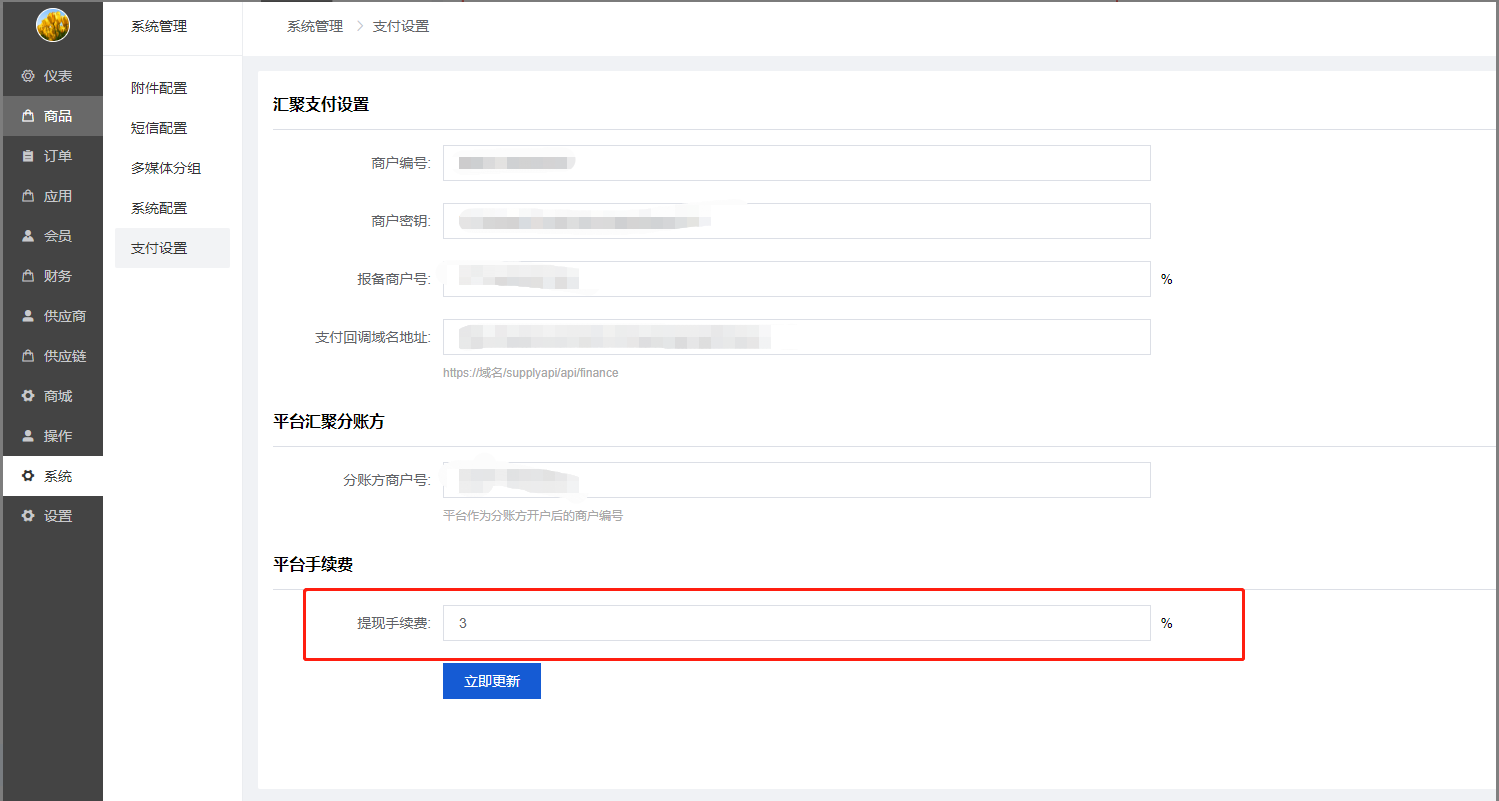 是给各个供应商分账时所扣除的额外手续费,百分比单位