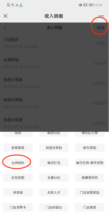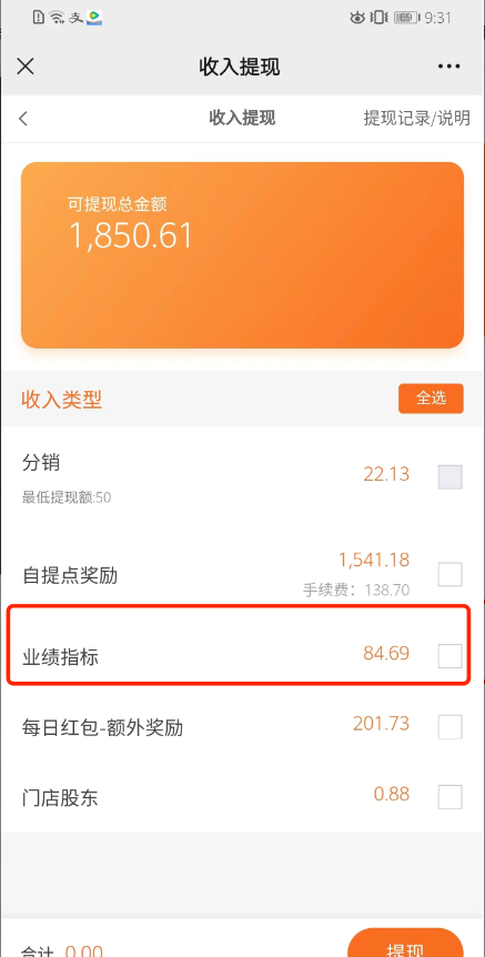 比如自定义名称“业绩指标”,推广中心、业绩奖励中心、提现申请页面、收入明细筛选收入页面显示如下。