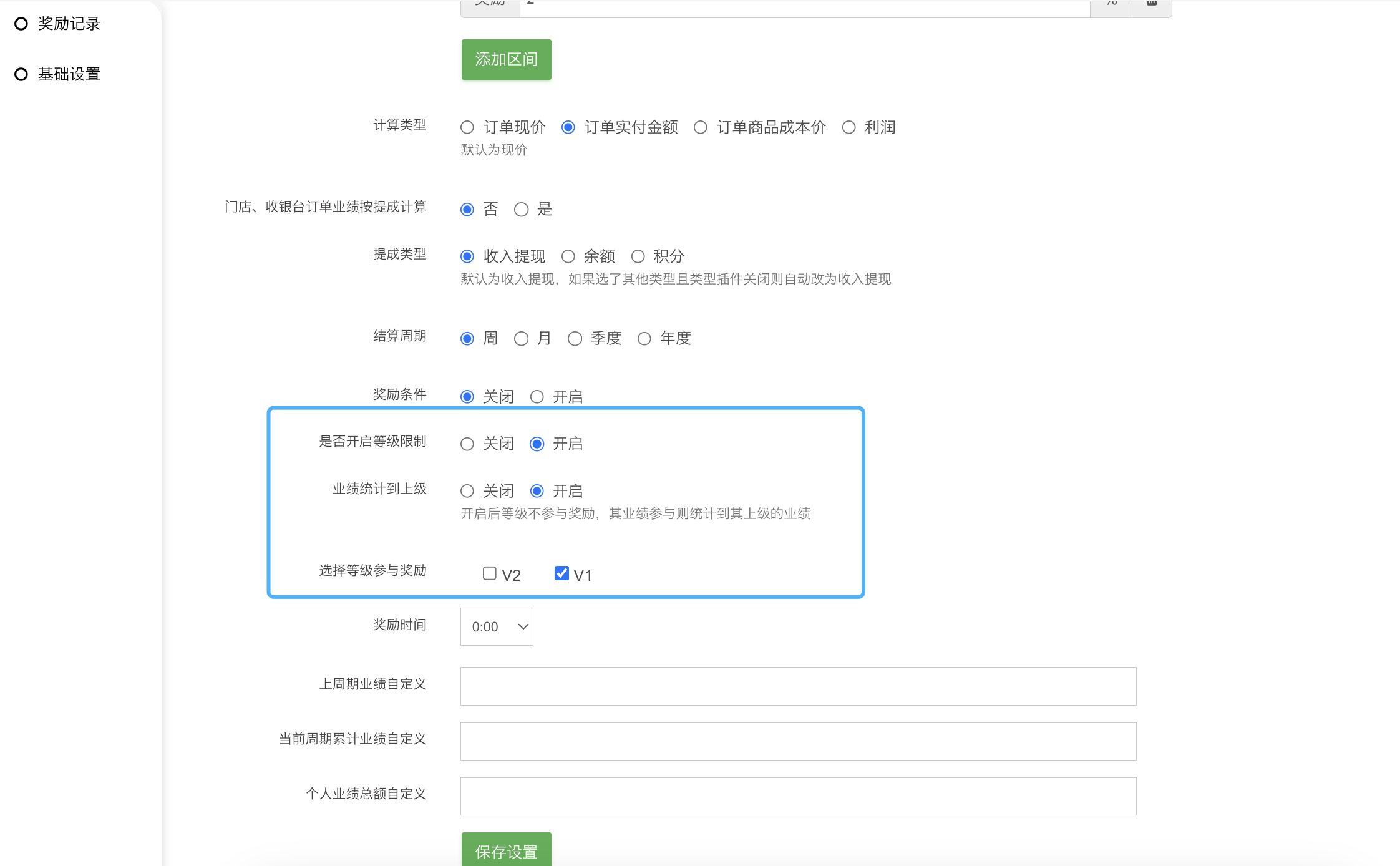 是否开启业绩统计到上级:开启业绩统计到上级需配合开启等级限制使用的。当开启等级限制,勾选的等级才会参与奖励,不勾选的等级不参与奖励也不会统计不勾选等级的业绩,这时候开启业绩统计到上级按钮,开启这个按钮后针对不勾选的等级产生的业绩就可以统计到上级业绩中去计算奖励。