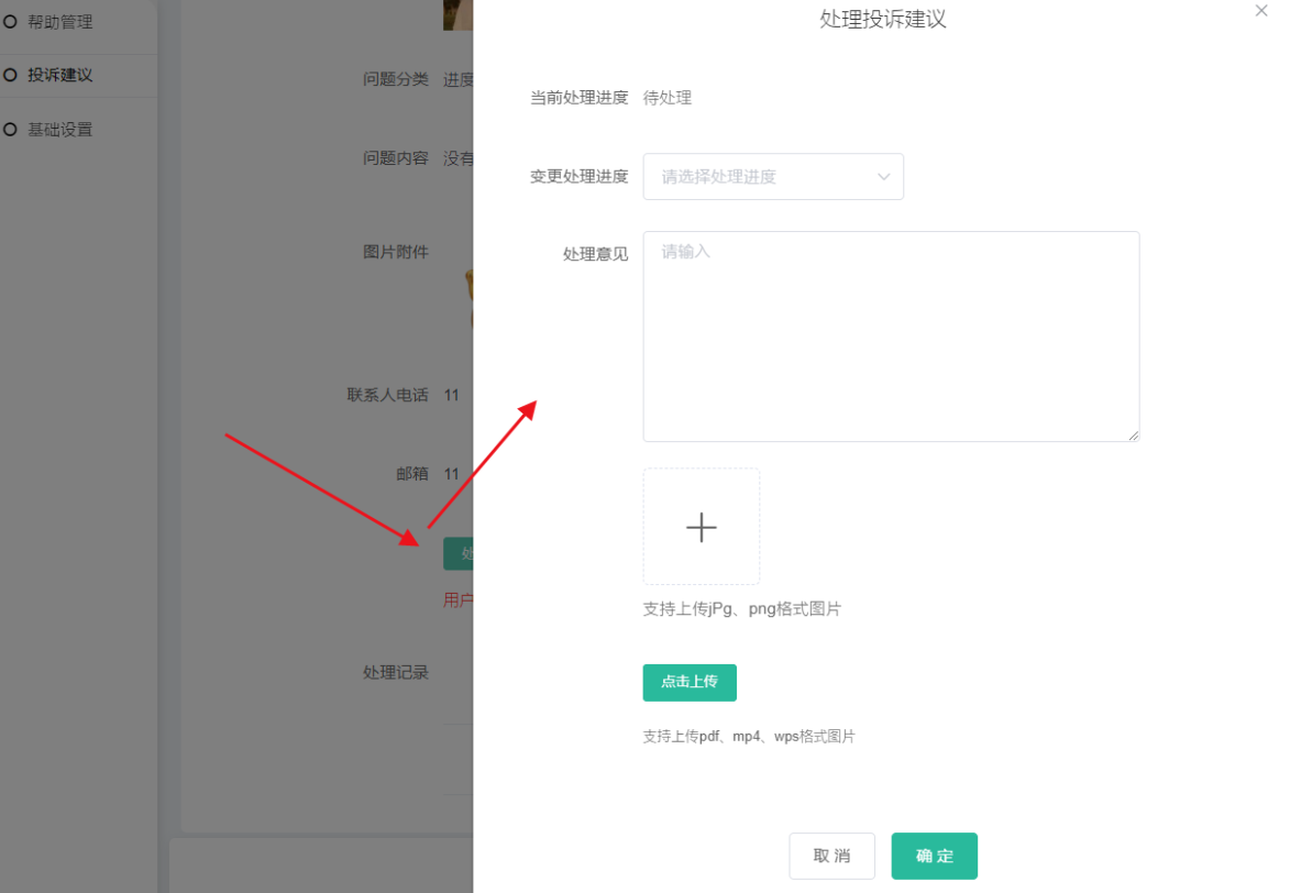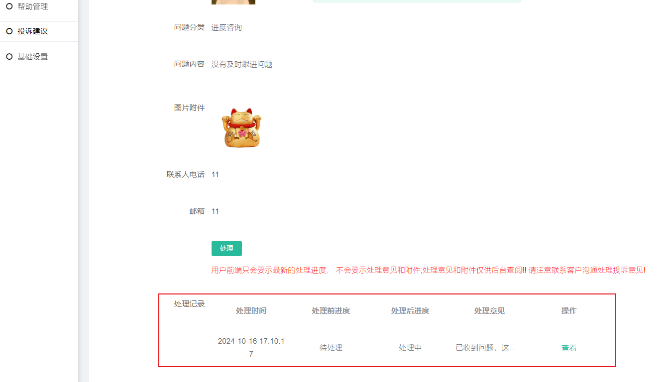 注意用户前端只会要示最新的处理进度, 不会要示处理意见和附件;处理意见和附件仅供后台查阅!! 请注意联系客户沟通处理投诉意见!