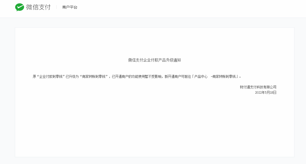 微信官方通知,原“企业付款到零钱”已升级为“商家转账到零钱”,已开通商户的功能使用暂不受影响,新开通商户可前往「产品中心 -商家转账到零钱」,开通商家转账到零钱。