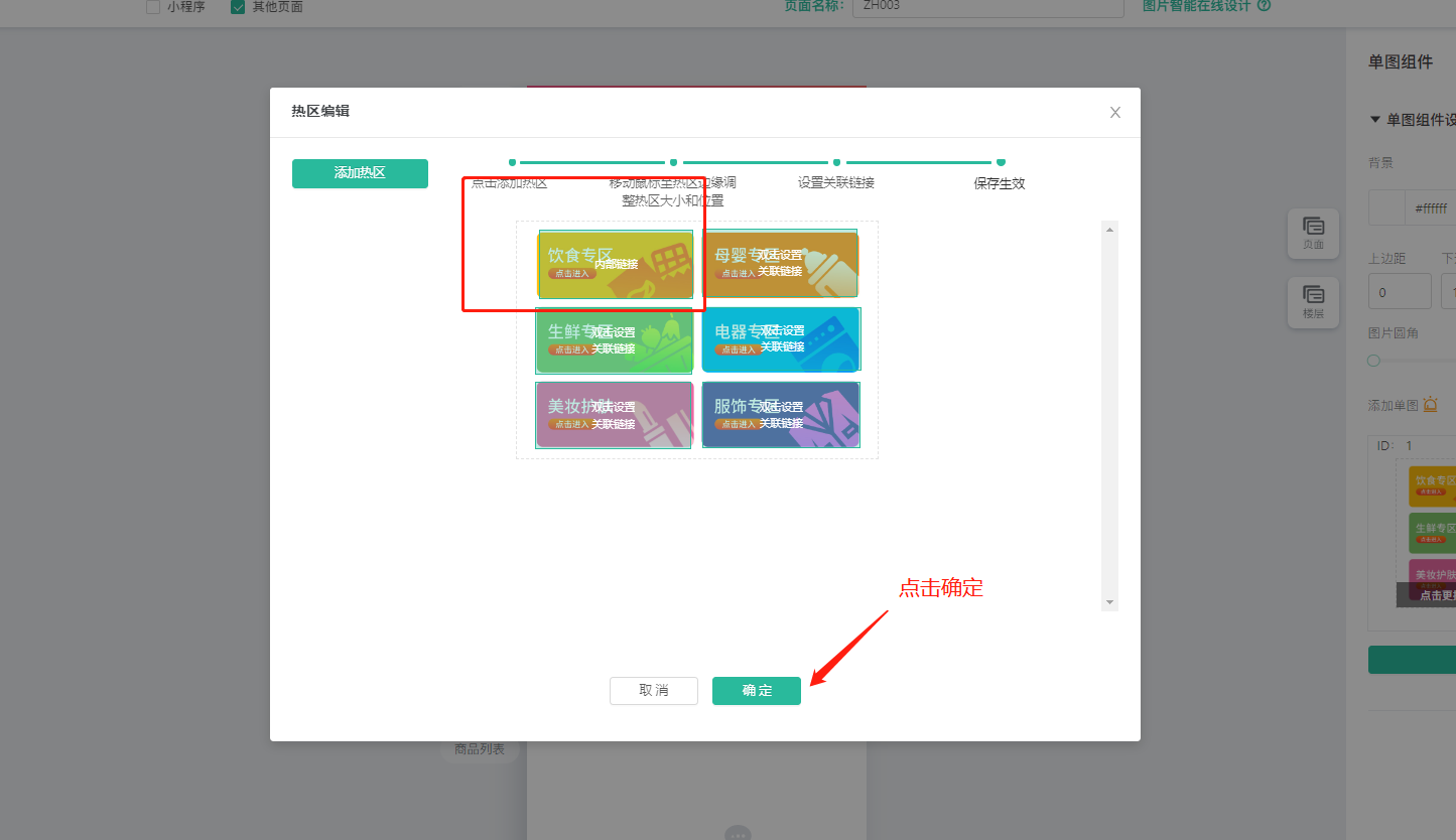 ⑧、第三种方法,可以拖动单图,上传设计好的单图,如果这张单图有多个专区,可以绘制热区,选择对应的商品 分类