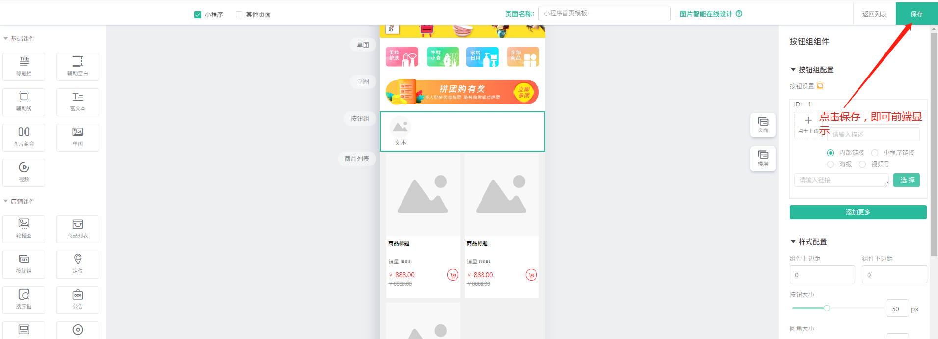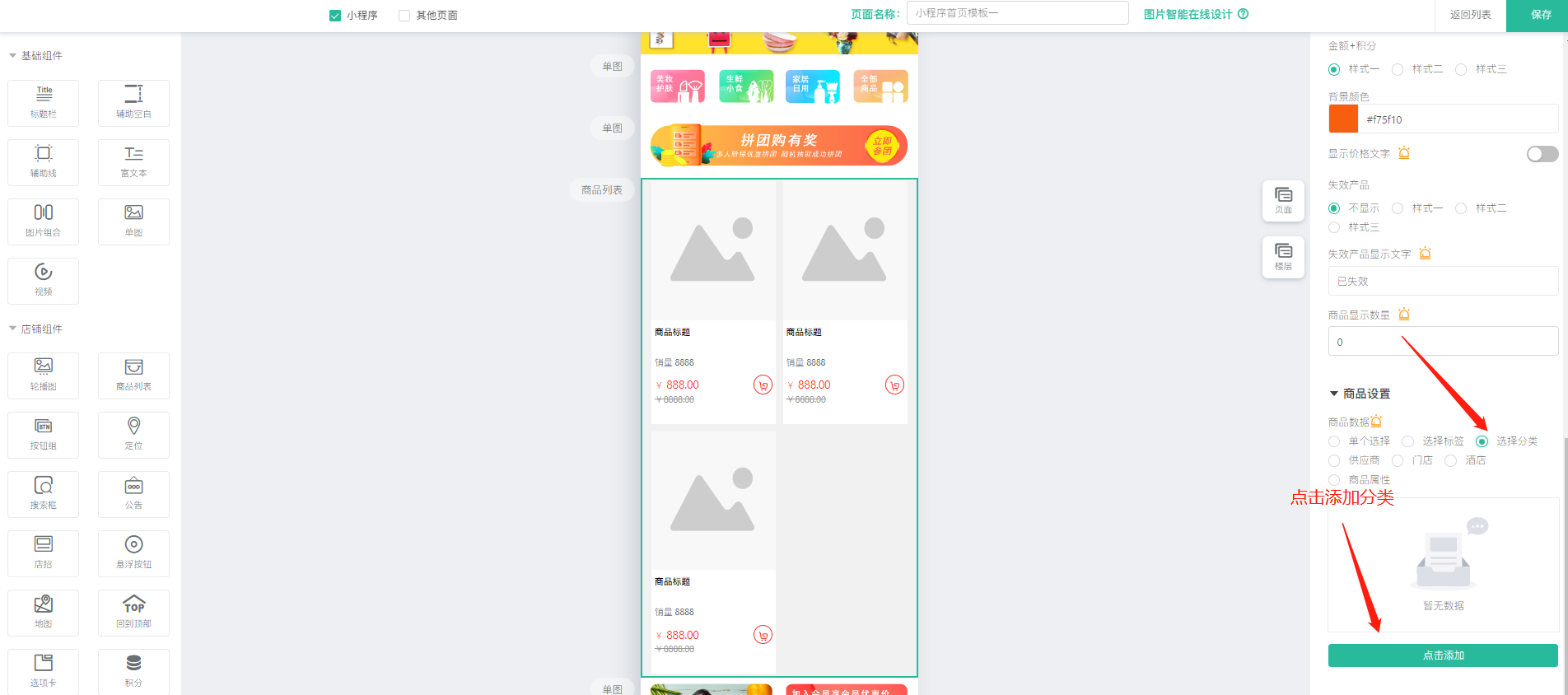 ②有三种方法可以展示前端,第一:拖拽左边组件:商品列表到中间首页模板的区域