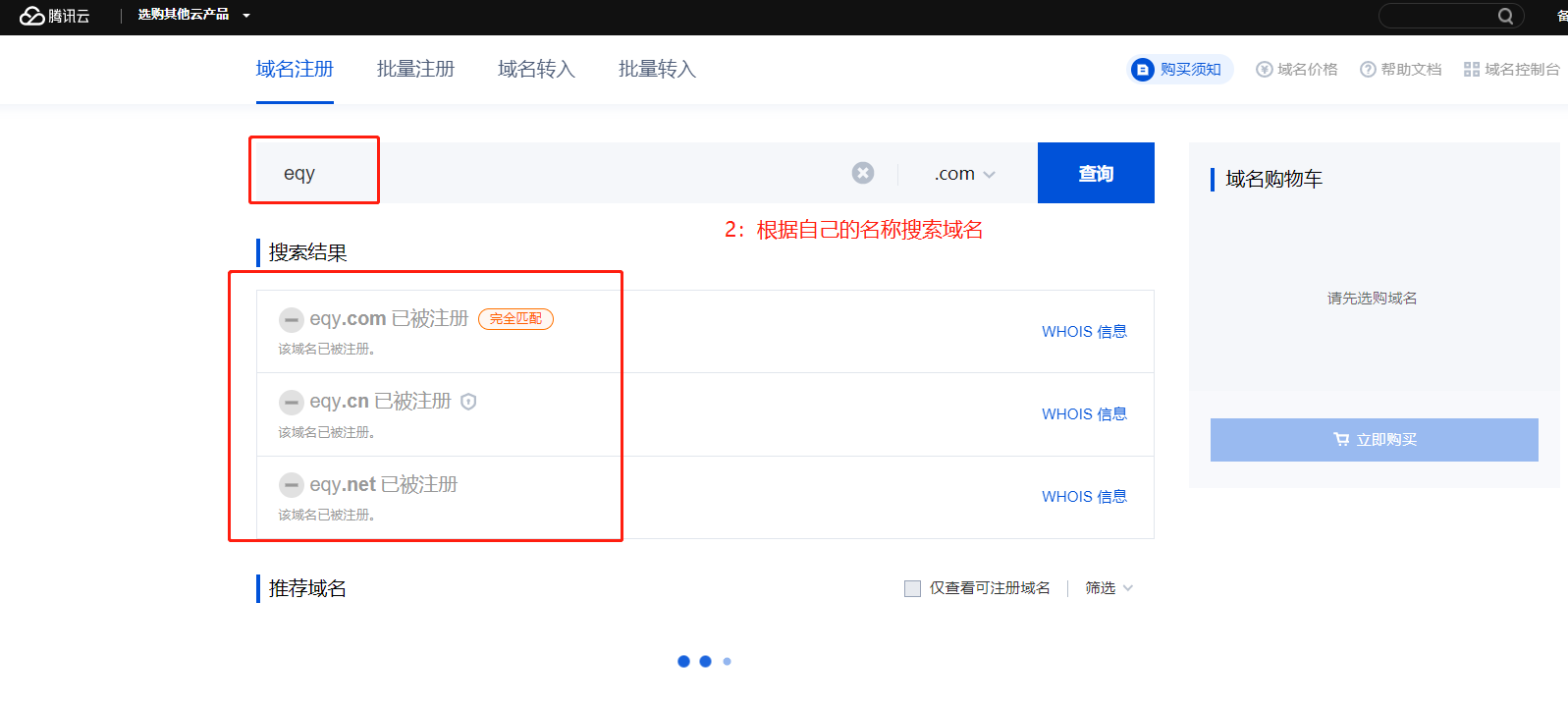 第二步:根据自己决定好的名字搜索域名,COM-CN为顶级域名,如果显示可用就可以直接注册