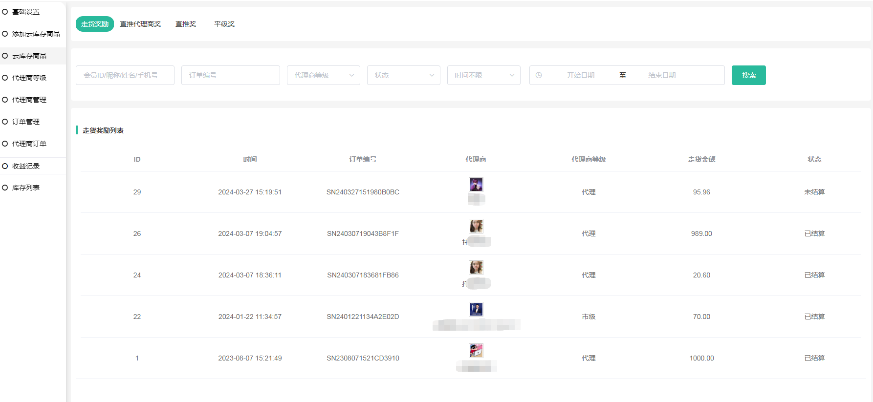 在对应栏目按钮可以查看到时间、订单编号、代理商、代理商等级、走货金额和状态