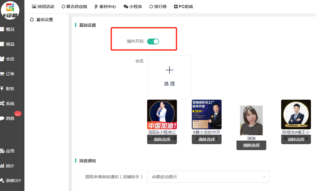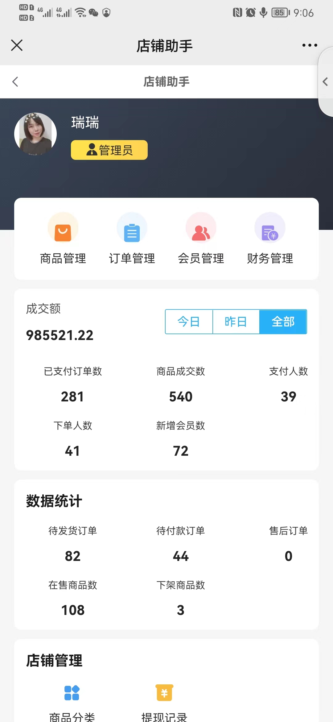 会员被添加为店铺助手管理员后,可在前端管理商城的商品、订单、会员、财务等。