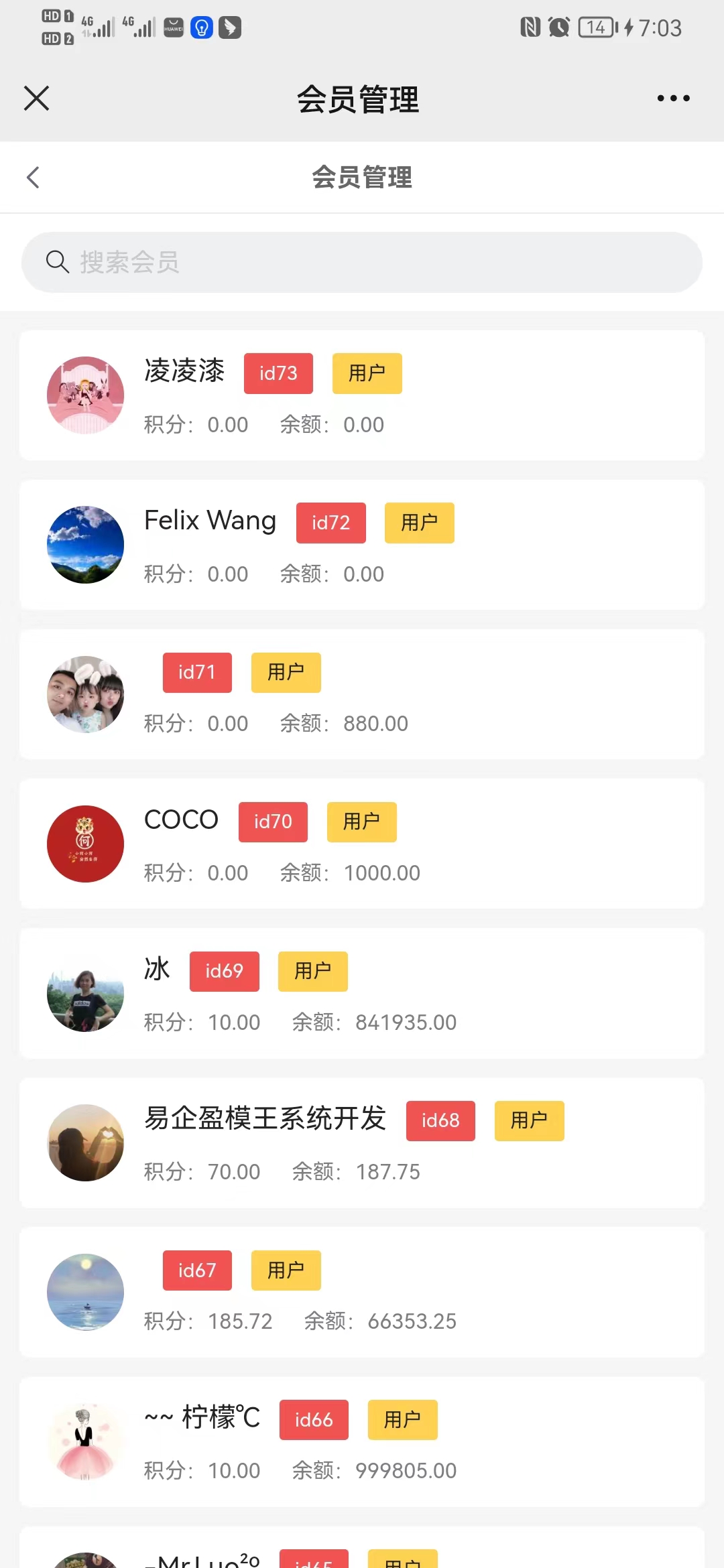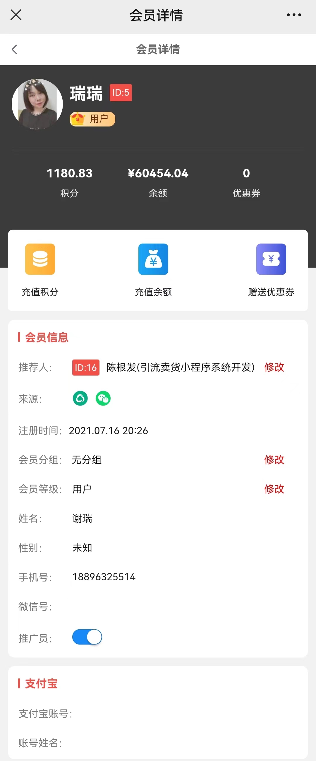 (2)会员信息:积分、余额、优惠券、推荐人、来源、注册时间、会员分组、姓名、性别、手机号、微信号、是否推广员、支付账号信息等