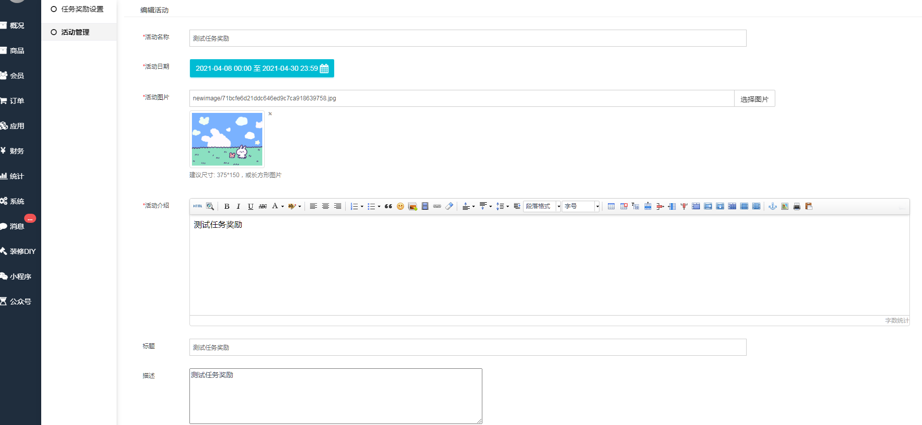 任务奖励:后台创建活动,活动里添加任务,满足任务设置的条件就可以获得奖励,奖励需要到前端会员中心领取。