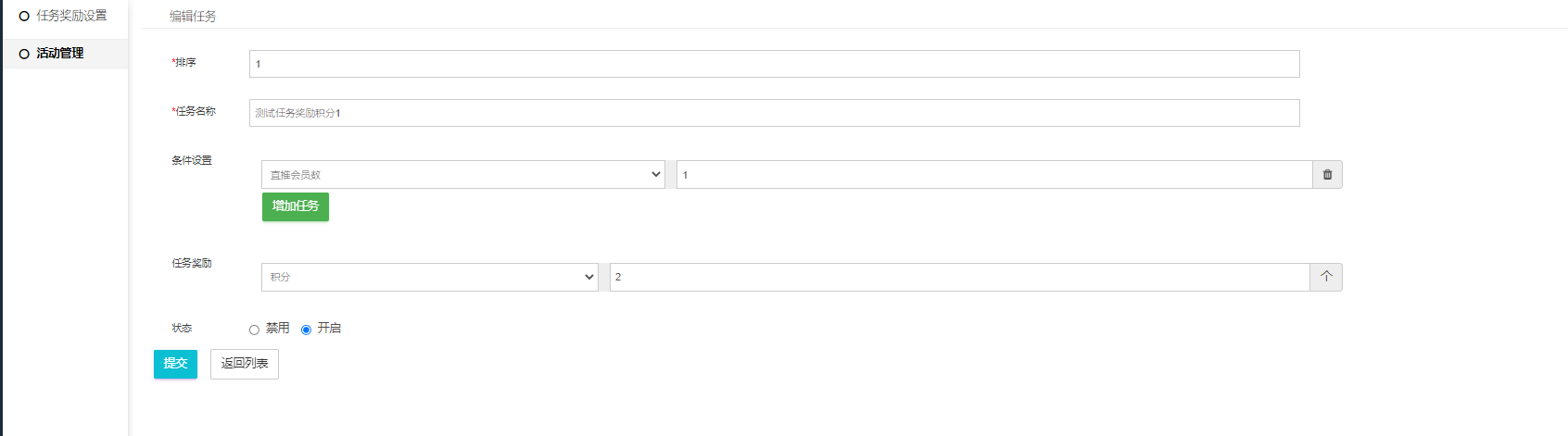 3、创建奖励任务,条件有两种,直推会员满和余额充值满。奖励有三种方式:积分,优惠券,爱心值。注意:创建好奖励任务后记得状态修改为开启
