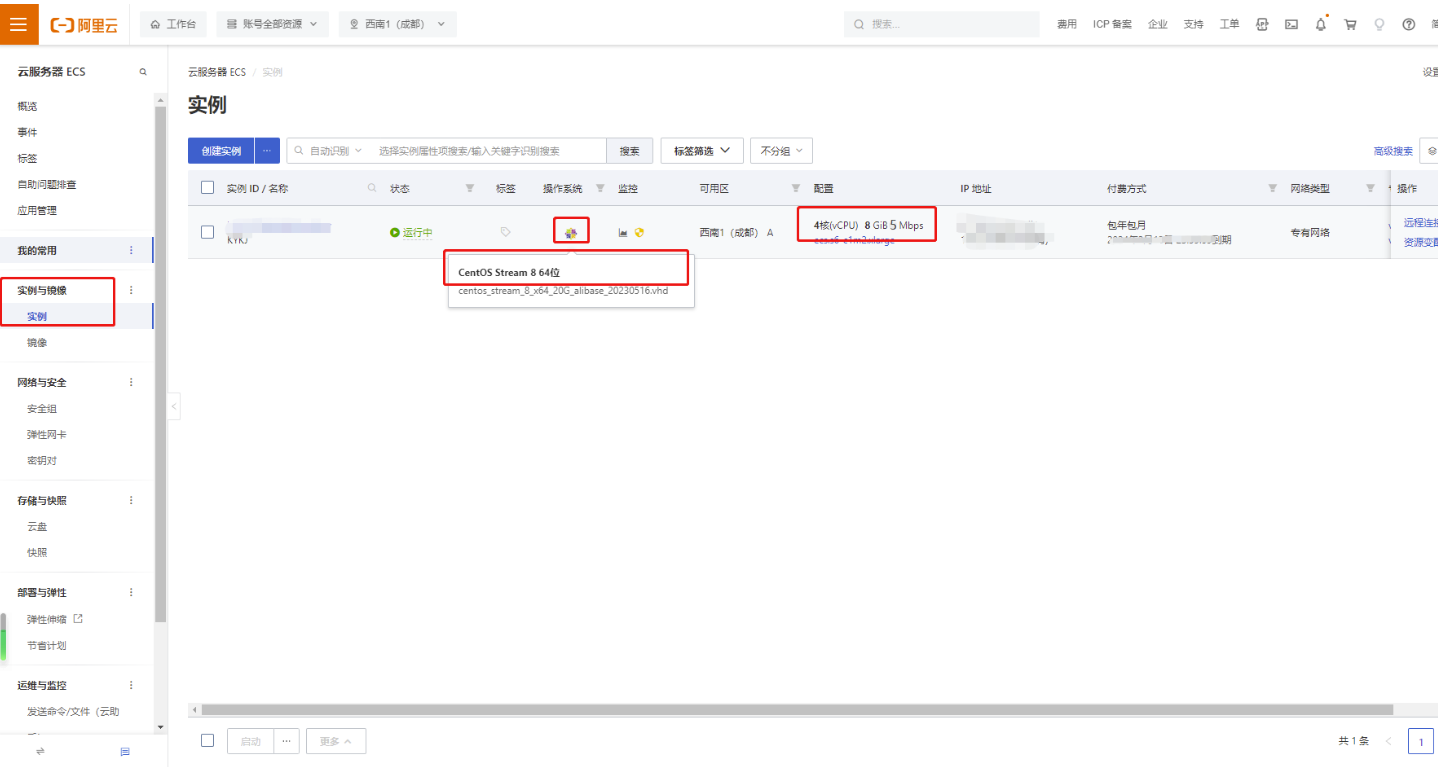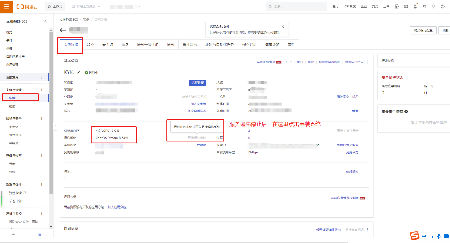 点击服务器进入实例详情,如服务器系统不是centos stream 8 64位需要停止服务器,点击重装系统到centos stream 8 64位。填写root密码后确认重装。