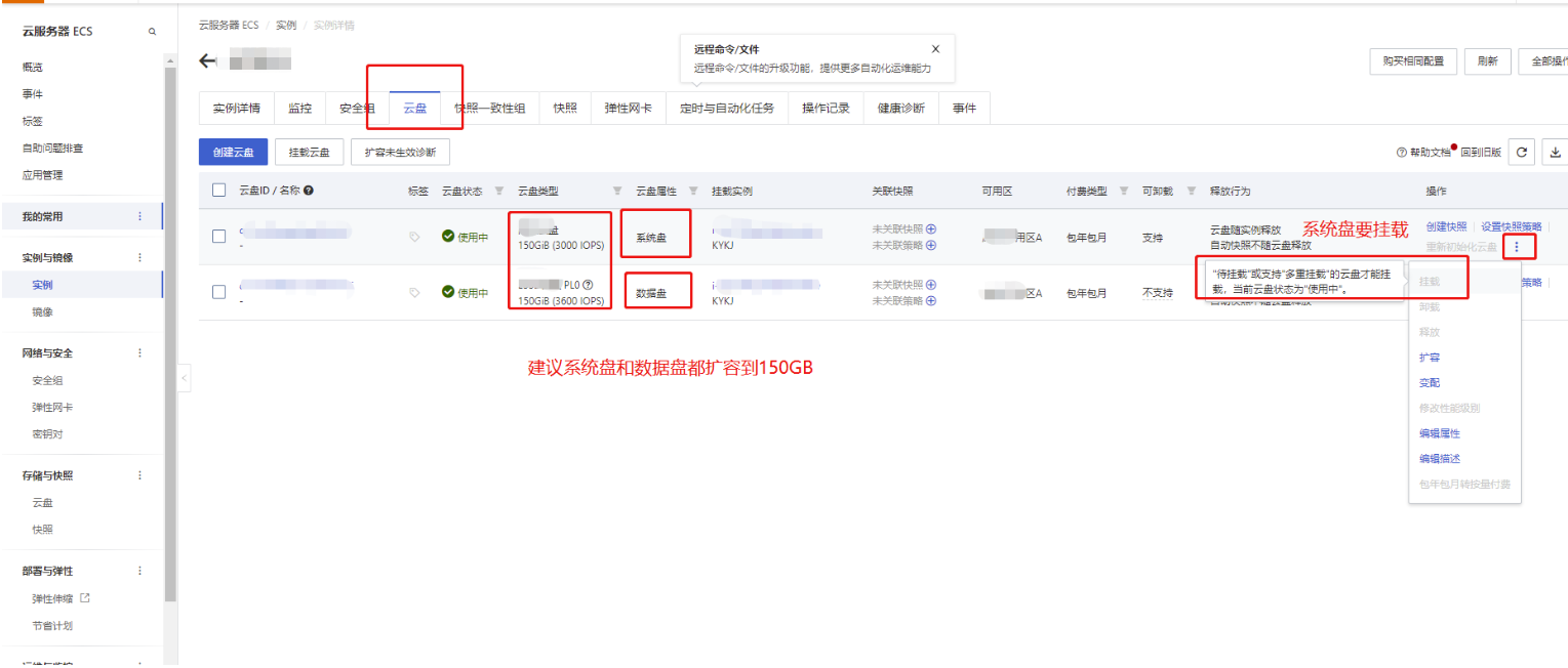 重装系统后,查看云盘,确认系统盘和数据盘都有扩容到150GB以上,如果只有系统盘的情况下,要点击创建云盘来购买数据盘。