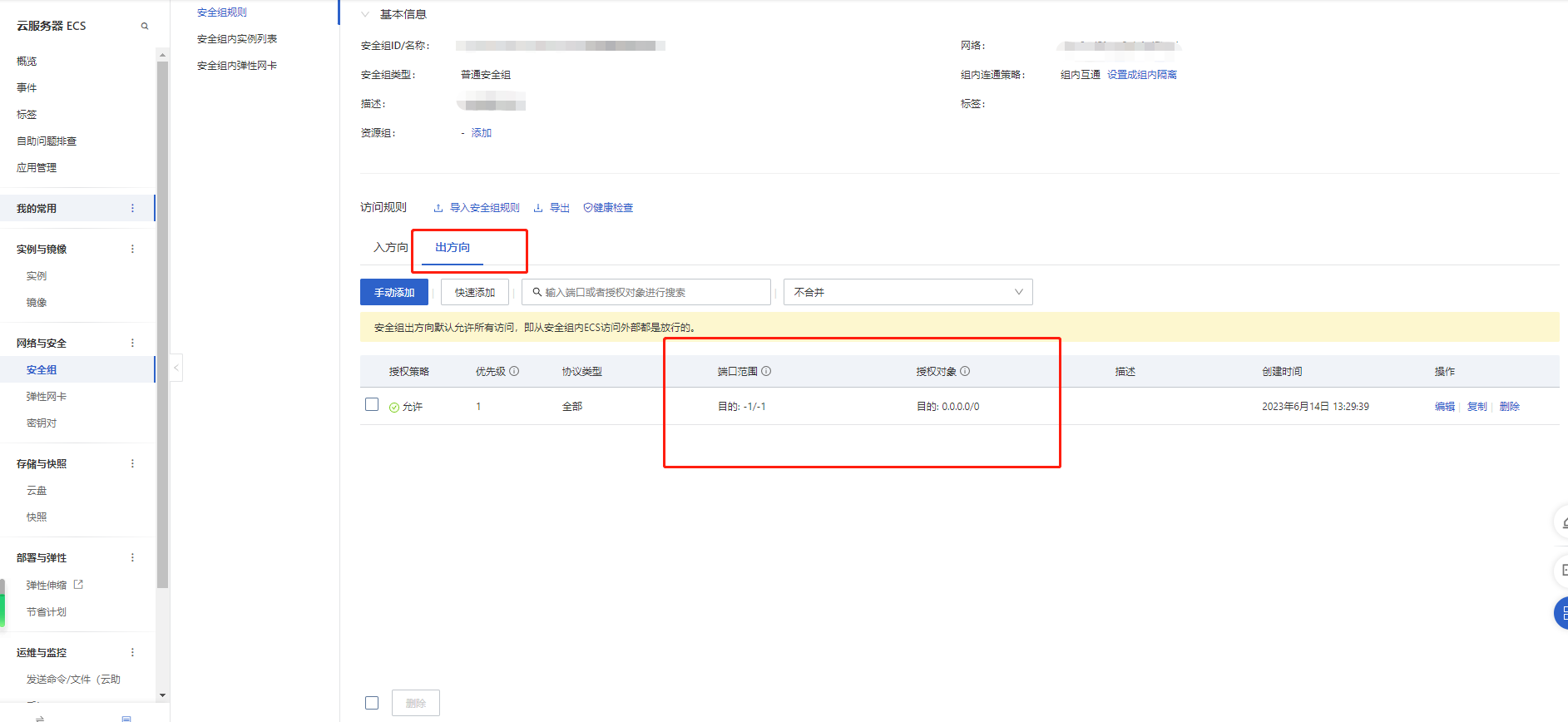 手动添加-协议类型选择:全部,端口范围:-1/-1 授权对象:0.0.0.0/0