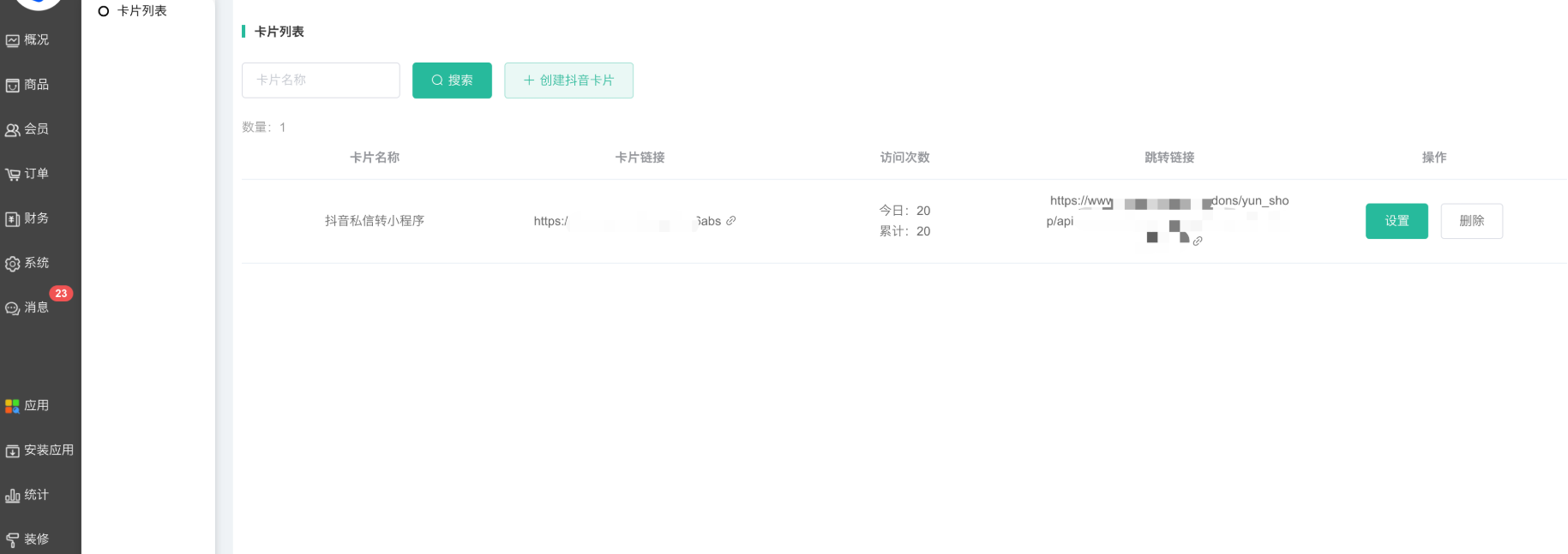 显示创建的抖音卡片:卡片名称、卡片链接、访问次数、跳转链接等。