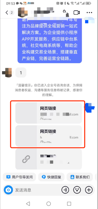 • 在会话页面点击链接打开,打开后会跳转到一个提示页面,这个是不可避免的;点击确定后跳转到链接页面,如果是跳转微信小程序链接会自动跳转到小程序页面;