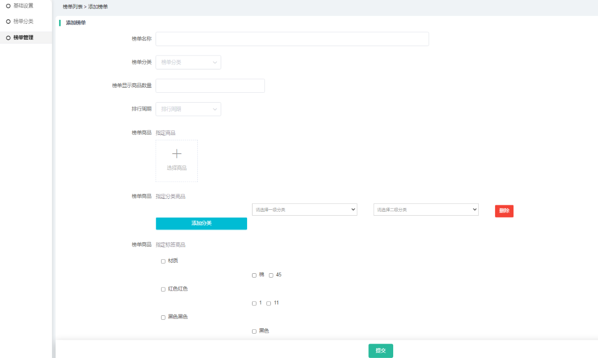 填写榜单名称、分类、banner图等;设置榜单数据统计周期,支持统计天、周、月、季度销售数据生成排行榜;根据指定商品、商品分类、商品标签选择榜单包含商品。