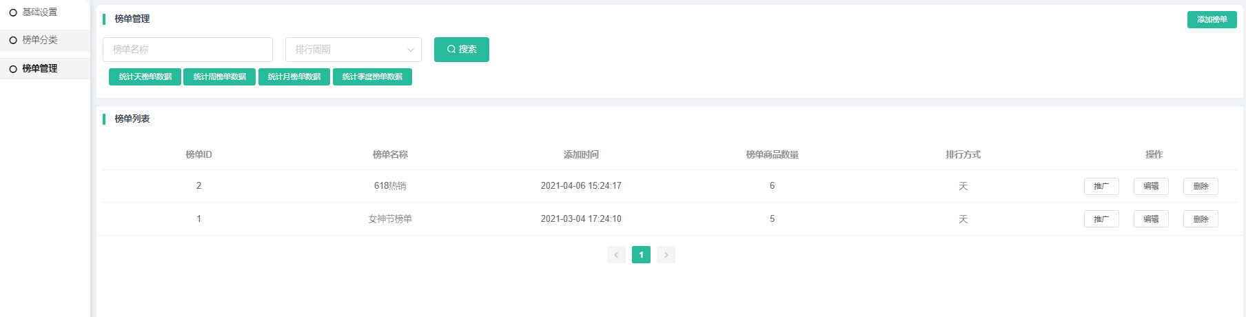 榜单列表:查看管理多个商品榜单,手动执行排行榜数据生成。