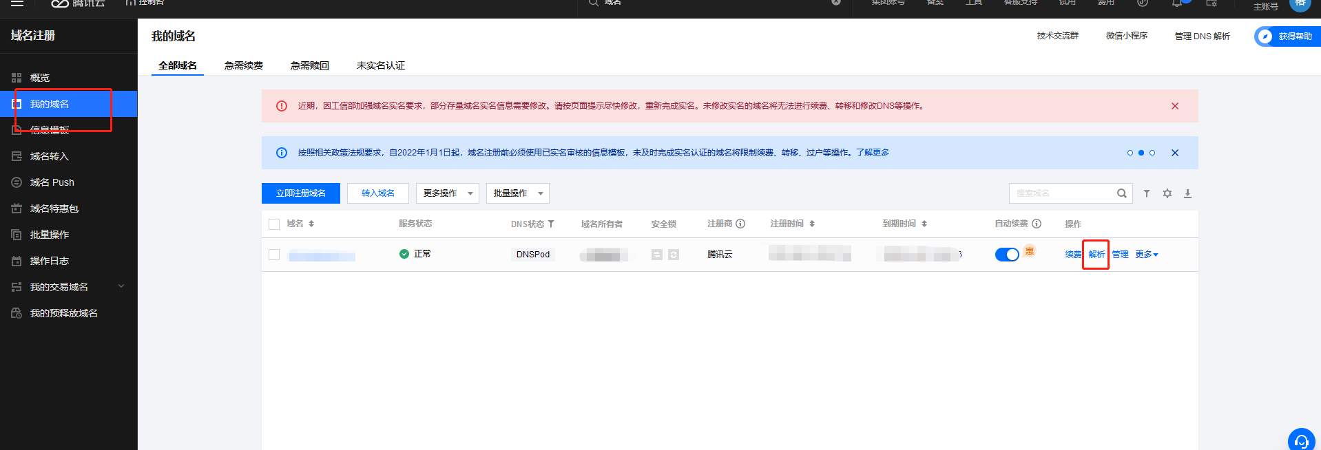 验证之后如果出现失败的提示,是因为在腾讯云后台没有添加对应的解析记录,解析记录需要按照第二点去腾讯云对应的域名里面去解析一下记录值