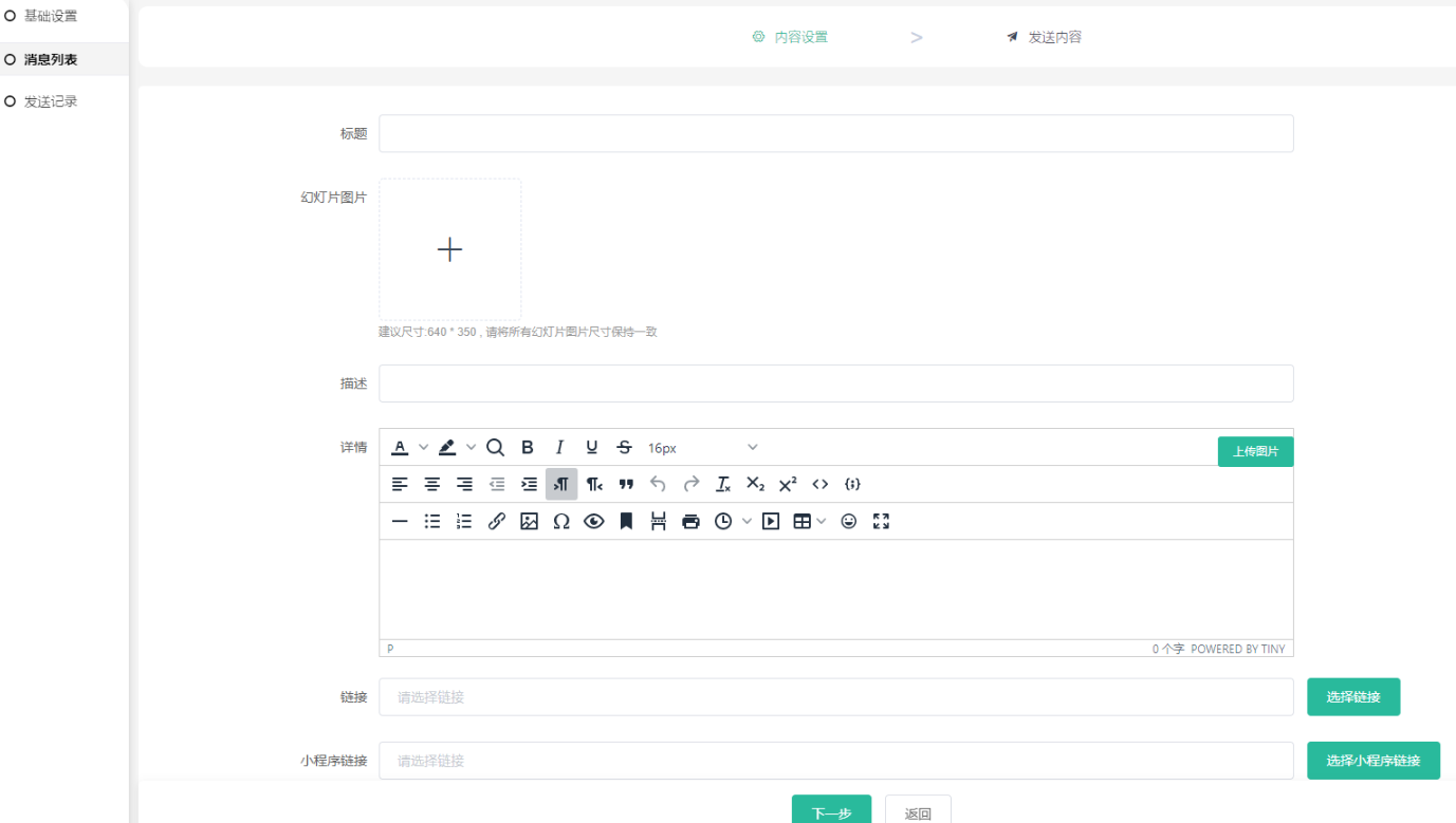 同时可选择消息点击跳转的链接,如果不设置链接,则默认为打开消息详情,设置链接则跳转到指定的链接。